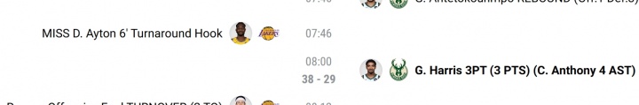 Trong mùa giải NBA thường lệ, Lakers đã dẫn trước Bucks 29 điểm với tỷ số 63-34 sau giờ nghỉ giải lao.