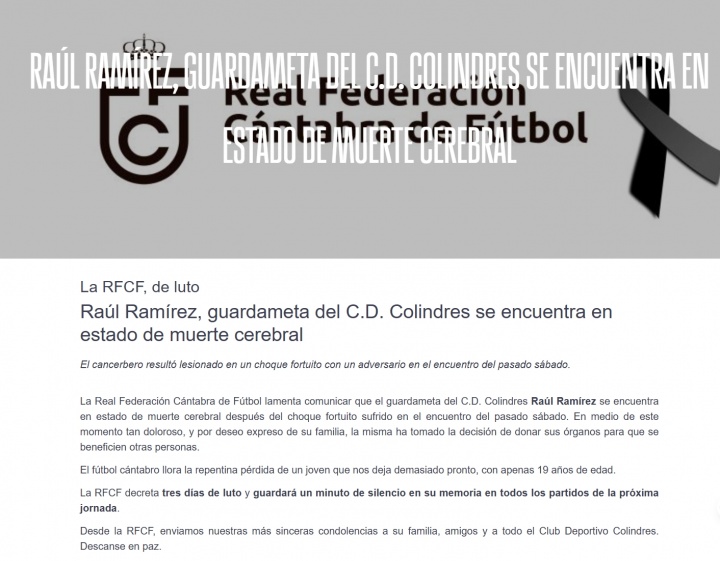 Thủ môn của đội bóng Tây Ban Nha, Collinders, đã chết sáng nay sau khi bị đánh vào đầu trong trận đấu vào thứ Bảy tuần trước. Real Madrid chính thức đưa ra một tuyên bố bày tỏ lời chia buồn cho cái chết của Raul Ramirez.