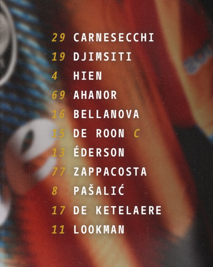 Atlanta xuất phát: 29-Carneseki, 19-Jimciti, 4-Sheehan, 69-Ernest Ahano, 16-Bellanova, 15-De Jongen, 13-Ederson, 77-Zappacosta, 8-Pasalic, 17-Decaterare, 11 - Lookman